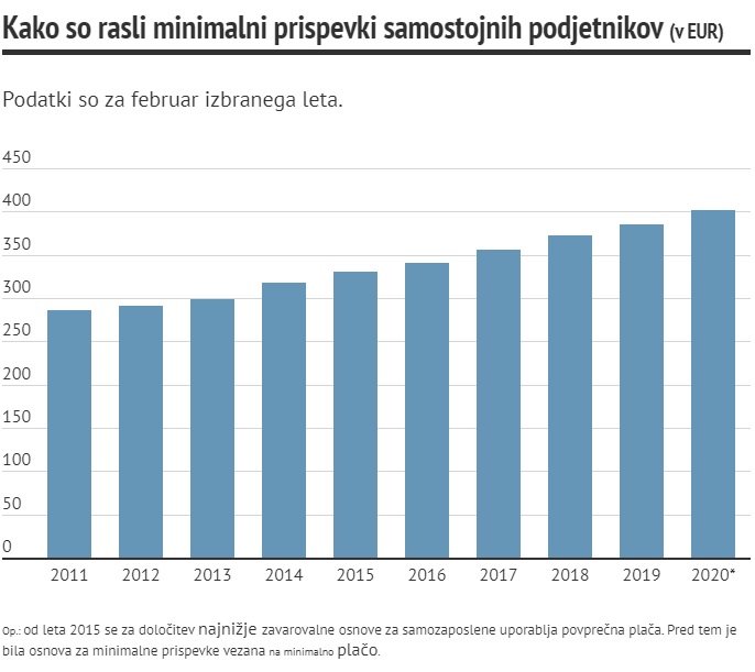 Od leta 2015 (odkar je višina minimalnih prispevkov vezana na povprečno plačo) se prispevki vsako leto zvišujejo. To niti ni nenavadno – v tem času je povprečna plača rasla, hkrati pa se je odstotek povprečne plače, na katerega se računajo minimalni prispevki, zviševal (do zdajšnjih 60 odstotkov, to je maksimum). Tako je minimalna zavarovalna osnova leta 2015 pomenila 54 odstotkov, v letu 2016 56 odstotkov ... Minimalni prispevki bodo tako letos za 22 odstotkov višji kot leta 2015.