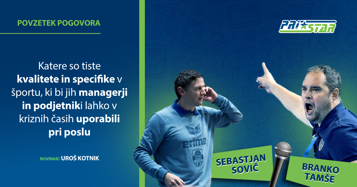 V času karantene zaradi že poznanih razlogov smo v podjetju Pristar pripravili zanimiv pogovor med dvema vrhunskima športnima trenerjema, Sebastjanom Sovičem in Brankom Tamšetom ter našim voditeljem Urošem Kotnikom na temo kvalitet in specifik športa, ki jih lahko v teh težkih časih za gospodarstvo preslikamo iz vrhunskega športa v gospodarstvo, zato da bomo lahko podjetniki lažje našli pravilno pot iz tega obdobja polnega izzivov.