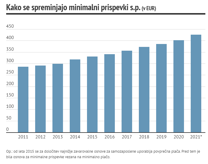 Od leta 2015 (odkar je višina minimalnih prispevkov vezana na povprečno plačo) se prispevki zvišujejo vsako leto. Vmes je seveda rasla povprečna plača, pa tudi osnova za izračun se je poviševala – leta 2015 se je zavarovalna osnova izračunala kot 54 odstotkov povprečne plače, potem pa se je vsako leto zviševala za dve odstotni točki do zdajšnjih 60 odstotkov.