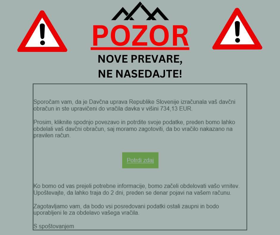 SPOROČILO : " Finančna uprava od zavezancev nikoli ne zahteva, da vnašajo svoje osebne podatke ali podatke o transakcijskih računih v spletne povezave ali SMS-sporočila. To je vsekakor znak, da gre za prevaro