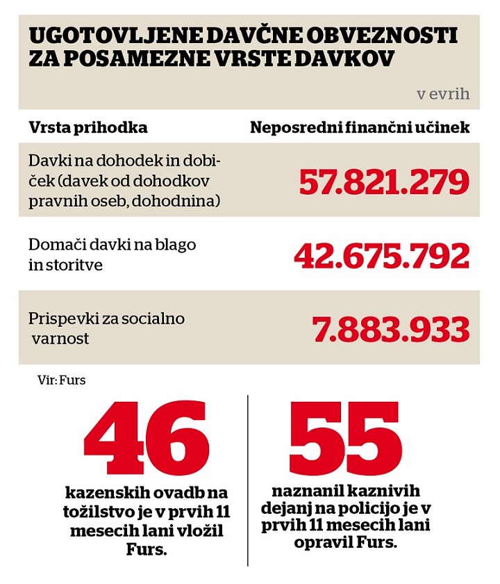 - 5.324 inšpekcijskih nadzorov, v katerih je bilo dodatno ugotovljenih za 90,7 milijona evrov davčnih obveznosti (za prvih 11 mesecev)