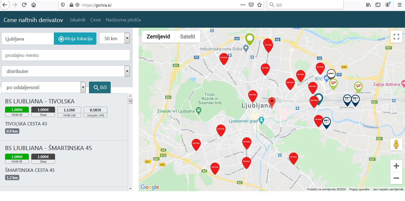 Spletna aplikacija goriva.si prikazuje maloprodajne cene naftnih derivatov na posameznih bencinskih servisih v Sloveniji.