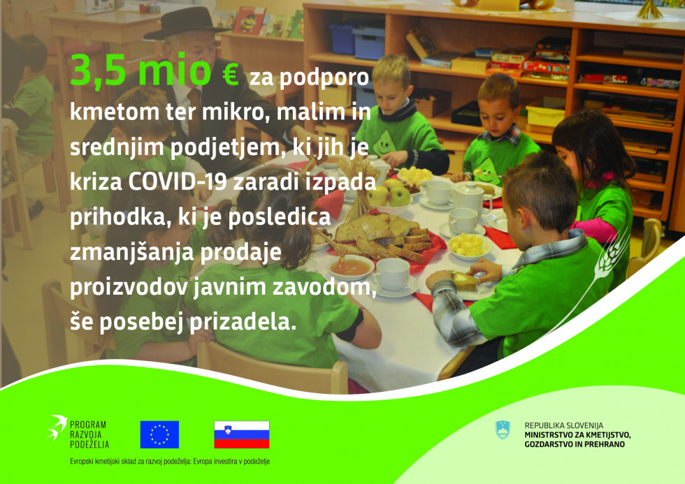 Ministrstvo za kmetijstvo, gozdarstvo in prehrano bo danes v Uradnem listu objavilo javni razpis za ukrep iz Programa razvoja podeželja za obdobje 2014–2020 - 21 Izjemna začasna podpora kmetom ter mikro, malim in srednjim podjetjem (MSP), ki jih je kriza zaradi covid-19 še posebej prizadela in imajo kot posledico zmanjšanja prodaje proizvodov javnim zavodom.