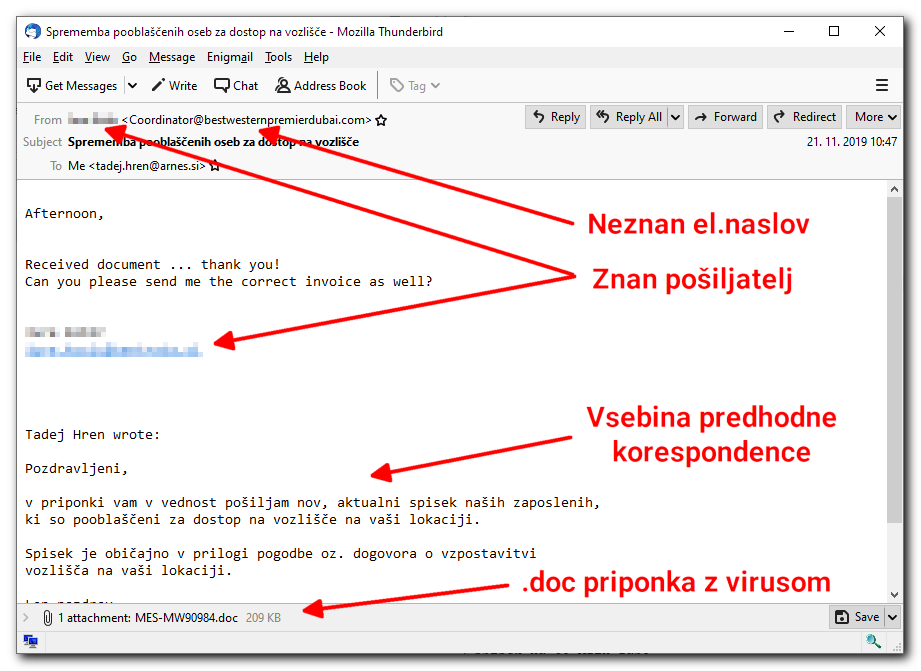 Na slovenske elektronske predale so v zadnjih dneh zaokrožila sporočila, ki v vsebujejo prejemnikovo preteklo korespondenco z znanim sogovornikom, pripeta pa imajo škodljiv Word ali Excel dokument. Sporočilo je posledica okužbe z Emotet trojanskim konjem, ki po okužbi ukrade Microsoft Outlook datoteke (torej preteklo elektronsko korespondenco žrtve). Napadalci škodljivo sporočilo pošljejo iz drugega poštnega predala pri tujem ponudniku. Sporočilo lahko vsebuje besedilo v angleškem jeziku, ki prejemnika poziva k odprtju pripetega dokumenta.