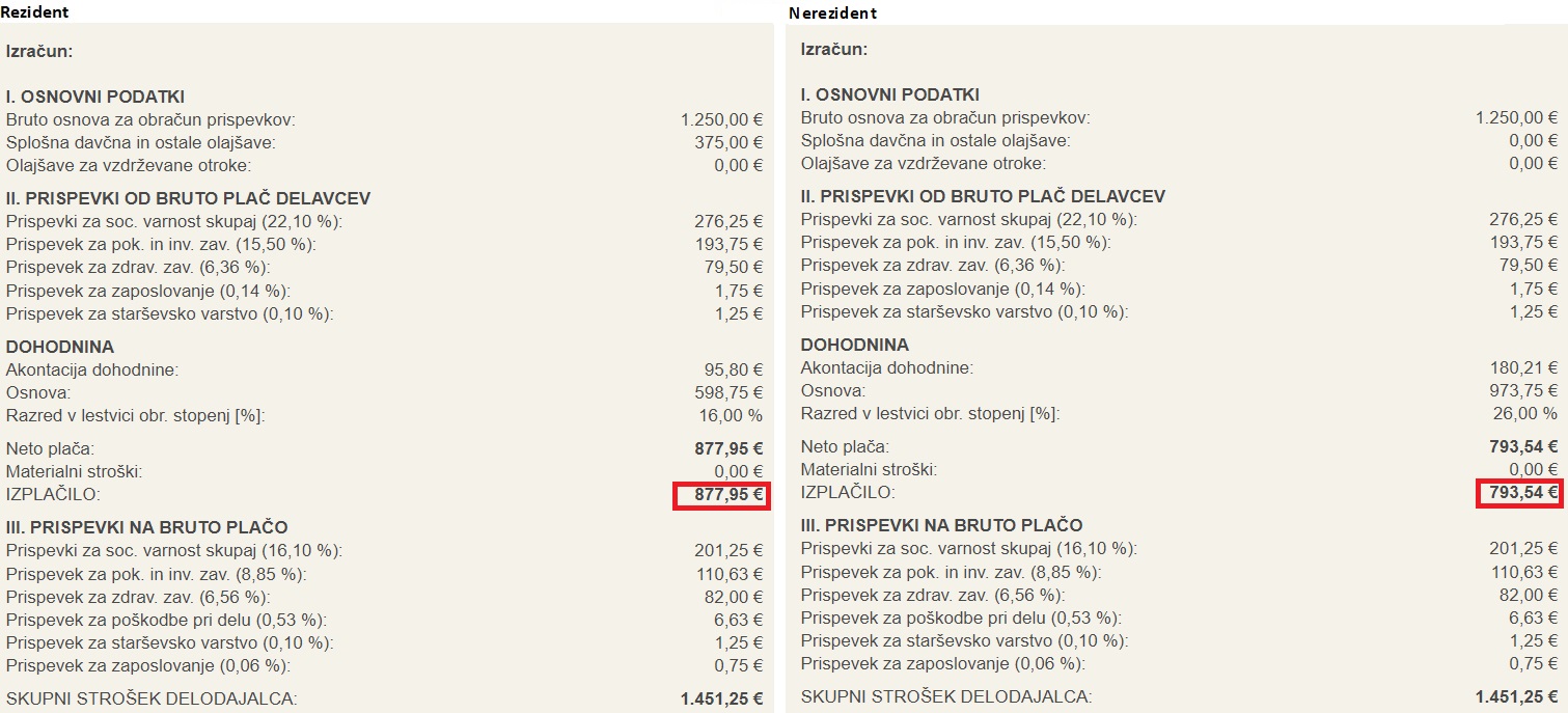 Spodaj je primer plače v znesku 1250 EUR bruto za rezidenta in nerezidenta, po zakonodiji v času nastajanja prispevka.