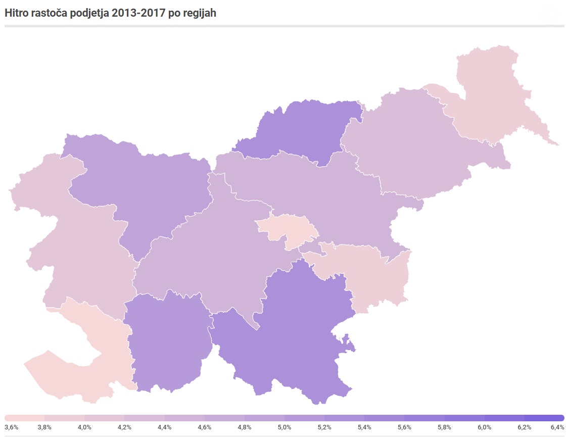 Število hitro rastočih podjetij je največje v Osrednjeslovenski regiji (1.925 podjetij oziroma 35,9 %), sledi ji Podravska regija s 693 oziroma 12,9 % podjetij. Glede na število podjetij v regiji ima največ hitro rastočih podjetij Jugovzhodna Slovenija (5,4 %), ki ji s 5,3 % sledi Koroška regija.