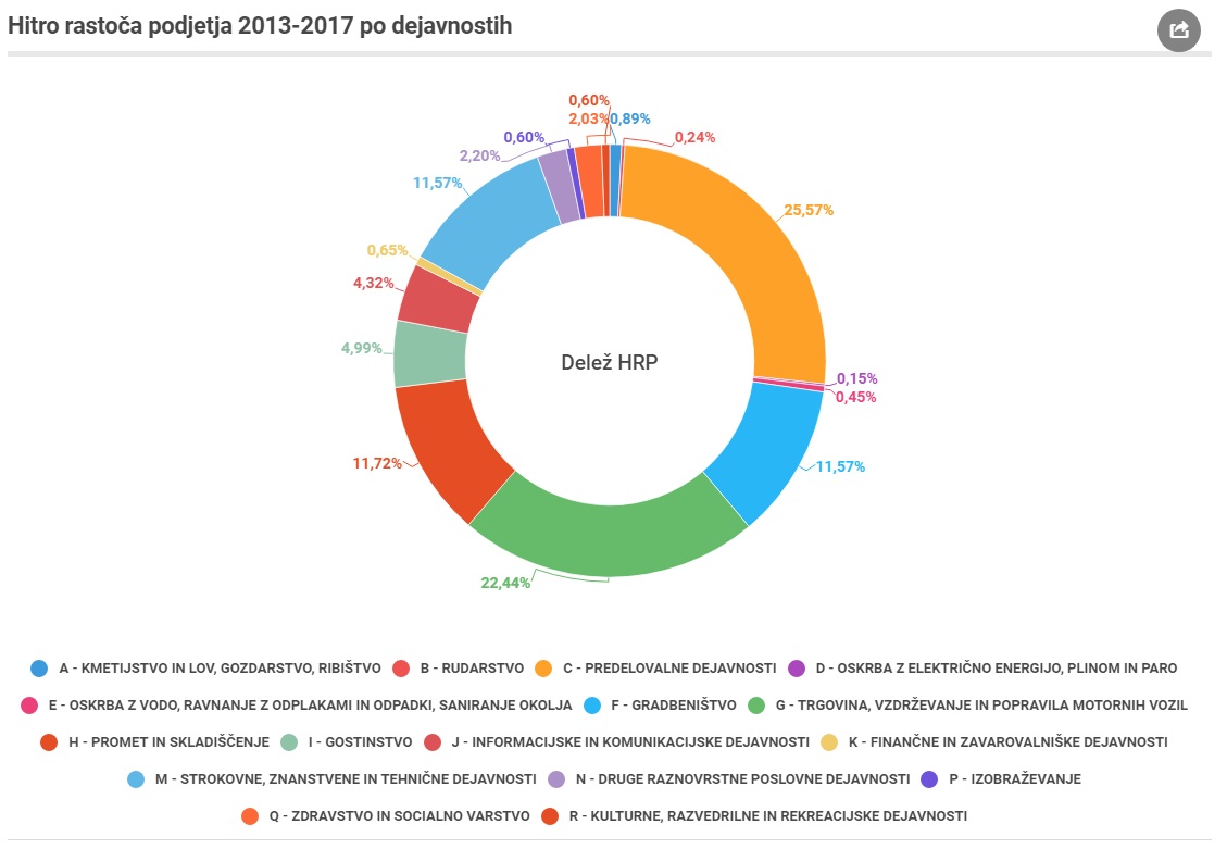 Najpomembnejša po številu hitro rastočih podjetij, ustvarjenih čistih prihodkih od prodaje in številu zaposlenih je predelovalna dejavnost. V tej dejavnosti je v letu 2017 delovalo 1.372 oziroma 25,6 % hitro rastočih podjetij, ki so zaposlovala skoraj polovico (44,2 %) vseh delavcev in ustvarile 8,9 mrd evrov čistih prihodkov od prodaje.