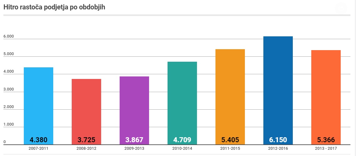 Primerjalna analiza podatkov med obdobjema 2007-2011 in 2013-2017 je pokazala zanimive rezultate. V tem časovnem obdobju so hitro rastoča podjetja v povprečju ustvarila 19.564 novih delovnih mest, povečala prodajo za 2,9 mrd evrov, manjša pa je tudi zadolženost podjetij.