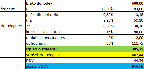 Delodajalcu se poleg bruto dohodka študenta obračuna tudi koncesijska dajatev (16%), dodatna koncesijska dajatev (2%), prispevek za poškodbe pri delu (0,53%), prispevek za zdravstveno zavarovanje (6,36%) in prispevek za PIZ (8,85%) ter DDV (22%) ... osnova za DDV so koncesijske dajatve in tudi prispevki.